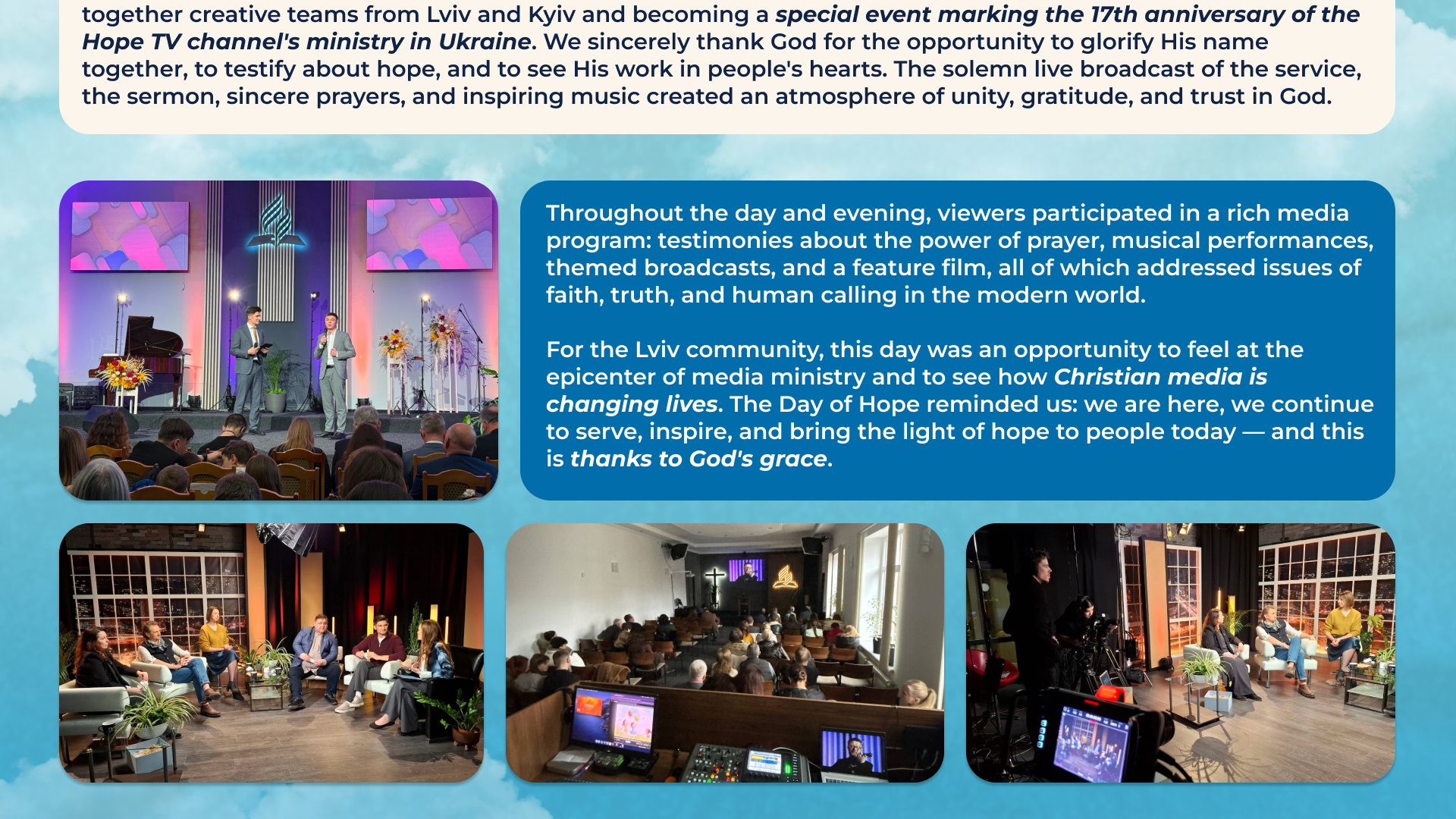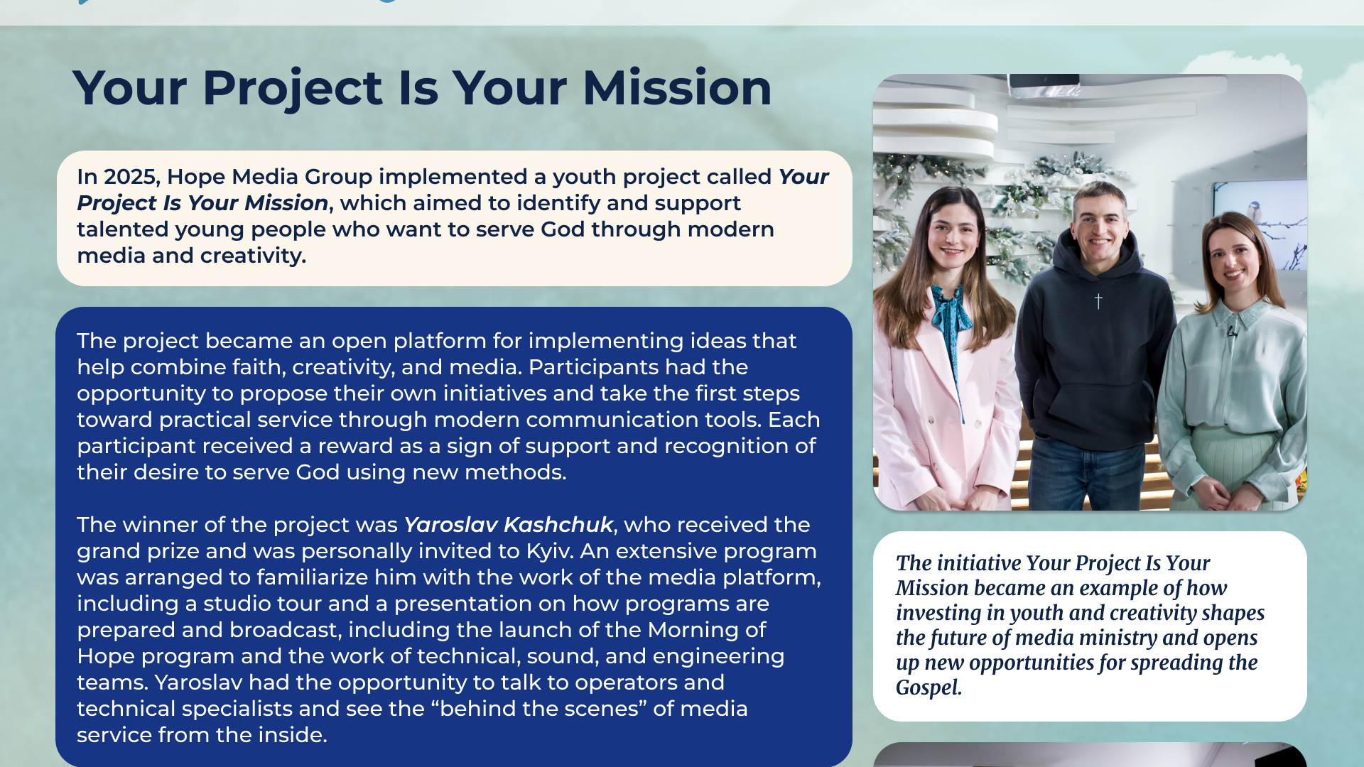 Angels of Hope is a project of the "Hope" Media Group, which helps every person on earth to become part of a team that brings hope and salvation with the help of mass media